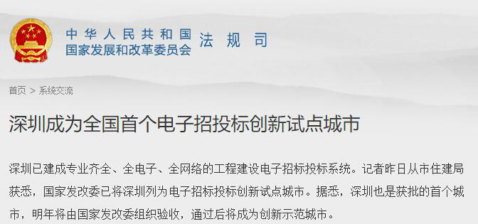 2014年7月,再次獲得國家肯定。全國首個電子招投標創(chuàng)新試點城市榮譽花落深圳!這一成就是對深圳電子招投標探索和實踐的又一認可,同樣也激勵著深圳向更高的層次邁進,而深圳也正在不斷的用自己的實際行動證明著自己。