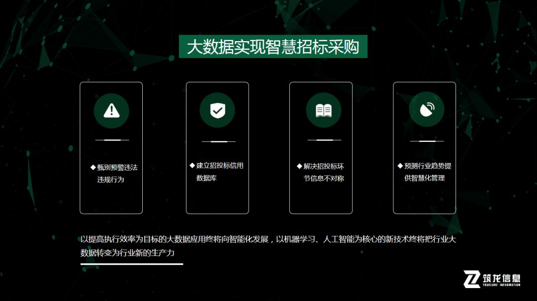 招標(biāo)采購行業(yè)在電子化的基礎(chǔ)上,通過大數(shù)據(jù)的應(yīng)用,整個行業(yè)水平被提升到更高的層面,隱藏在交易數(shù)據(jù)中的規(guī)律和價值不斷被攫取和利用,大數(shù)據(jù)在行業(yè)內(nèi)的角色大有演變?yōu)樯a(chǎn)力的趨勢。同時,我們深信隨著大數(shù)據(jù)技術(shù)的深度應(yīng)用,以提高執(zhí)行效率為目標(biāo)的大數(shù)據(jù)應(yīng)用終將向智能化發(fā)展,以機(jī)器學(xué)習(xí)、人工智能為核心的新技術(shù)終將把行業(yè)大數(shù)據(jù)轉(zhuǎn)變?yōu)樾袠I(yè)新的生產(chǎn)力。