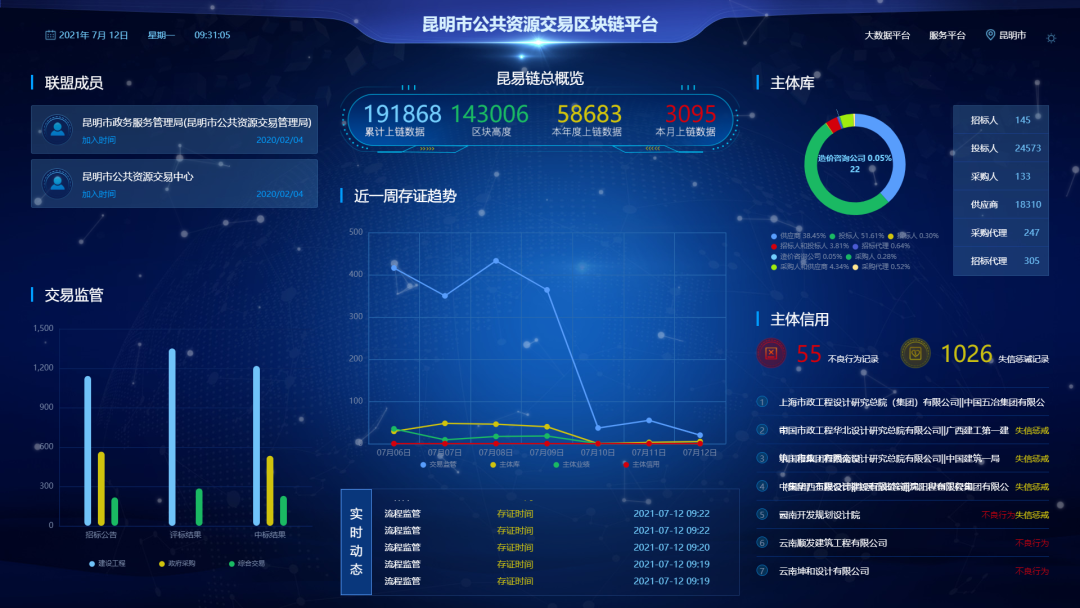 目前,“昆易鏈”通過對交易主體的56個全流程操作環節數據存證、查驗、公開,結合昆明市“四+一”智慧監管體系,形成了“區塊鏈服務+區塊鏈電子證據+智慧監管”的公共資源交易監管新模式。